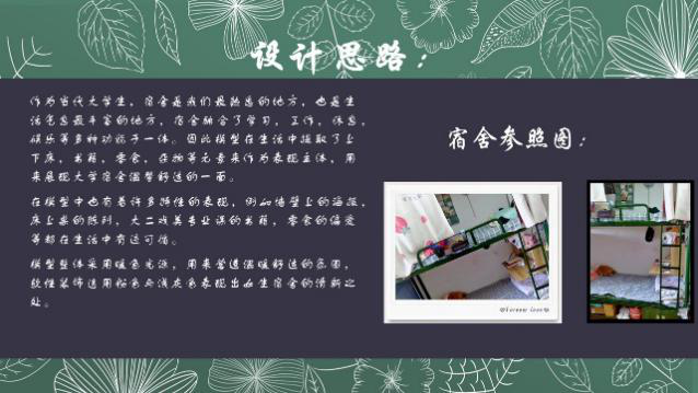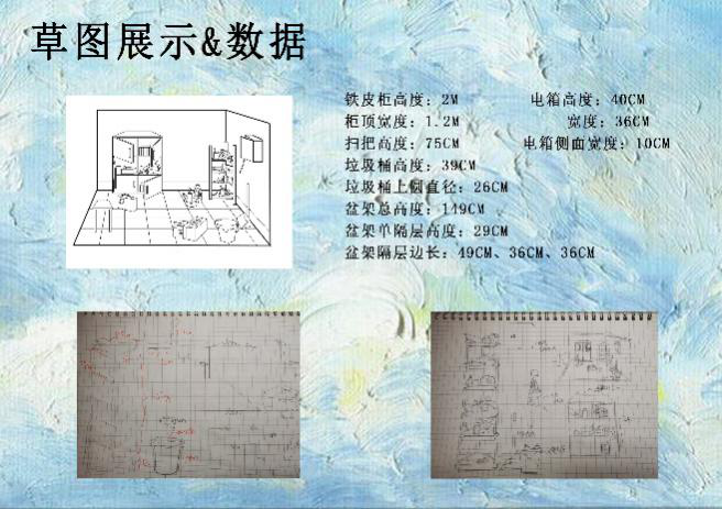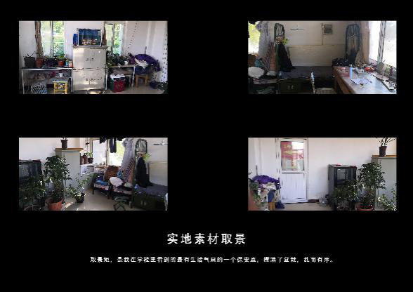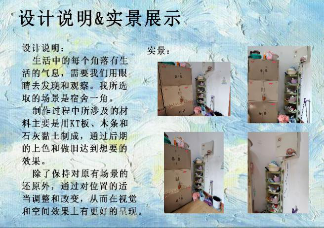 个人设计说明:生活中的每个角落都有生活的气息,需要我们用眼睛去发现和观察。我所选取的是宿舍一角。