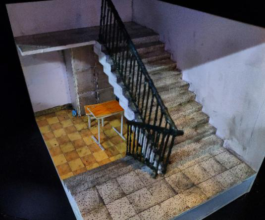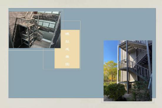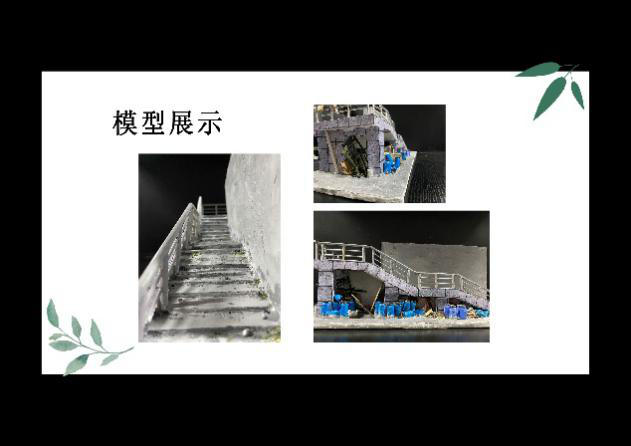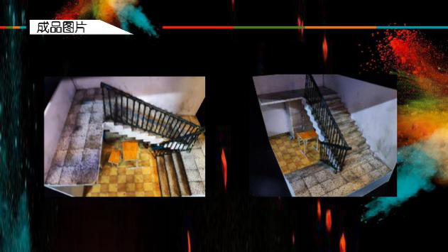 设计思路:根据学校一角的楼梯角落做出模型,用可塑陶泥做出墙壁纹路,楼梯采用ave板通过切割拼接而成。