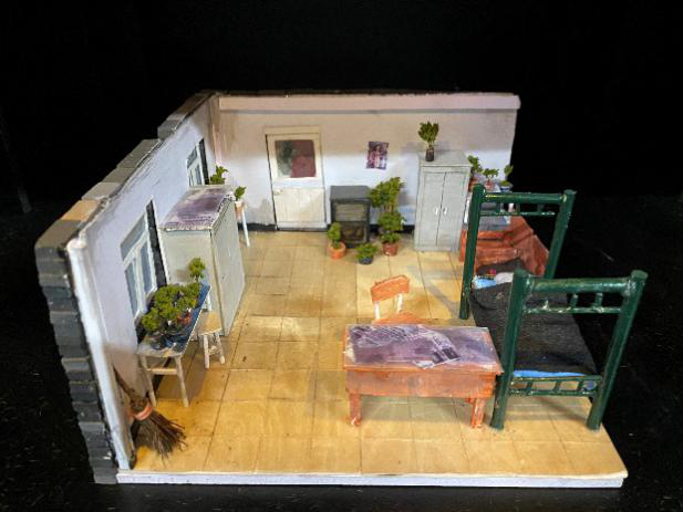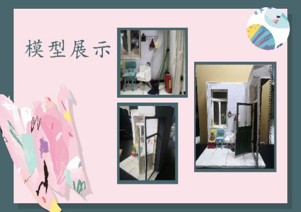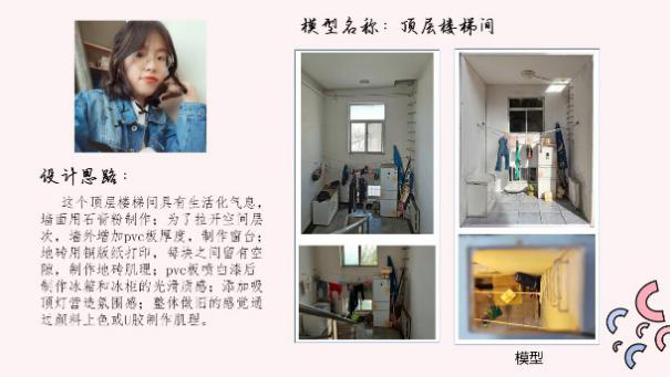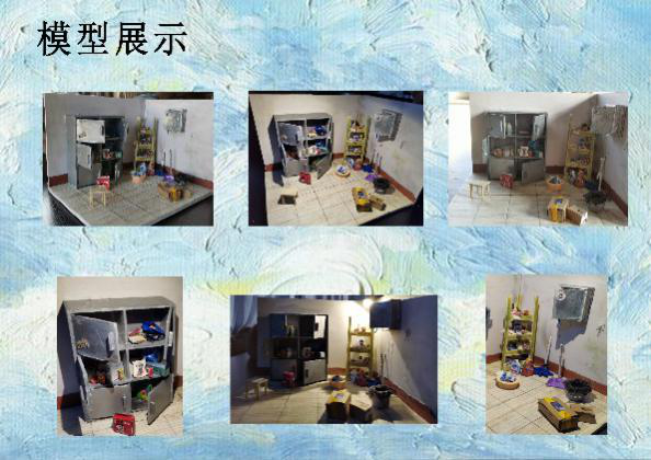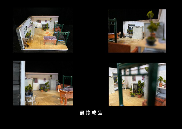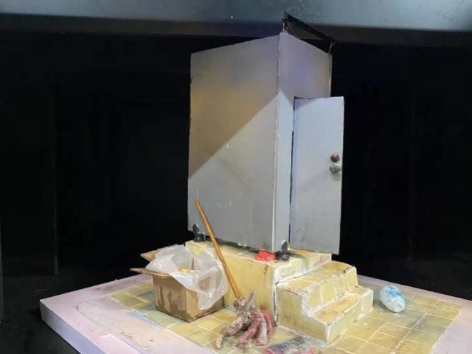 设计说明:选择有生活化气息的楼梯间。墙面用pvc加上石膏和白乳胶,制作出真实墙面的感觉;尝试在窗户边缘的外墙上增加厚度,通过增加窗户的厚度,做出窗台的层次和结构;地板用铜版纸打印,做出地板之间间隙的感觉;冰箱和冰柜用pvc做出大体结构,觉得缺少物体本身的质感,通过喷白色亮漆实现它们表面的光泽,用铁丝作为连接让冰箱门可开关;墙上的铁勾用生锈液做出生锈的感觉;用颜料上色的方式使墙面变得陈旧,通过尝试发现,U胶和陶泥可以做出肌理的效果,再在上面上色,使做旧的效果真实;衣架用铁丝编出造型;小的滑板车用pvc做出形状后上色,车轱辘尝试用陶泥捏出形状;最后尝试用等比例的吸顶灯营造整体的氛围。