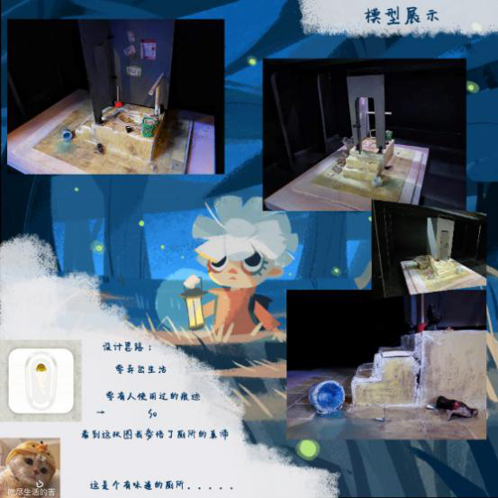 我的着眼点在于人们的不文明行为,对于厕所的卫生,设施的保护等等进行一个还原,希望可以让人意识到整洁干净的厕所是对无论是卫生还是心情都是有帮助的。