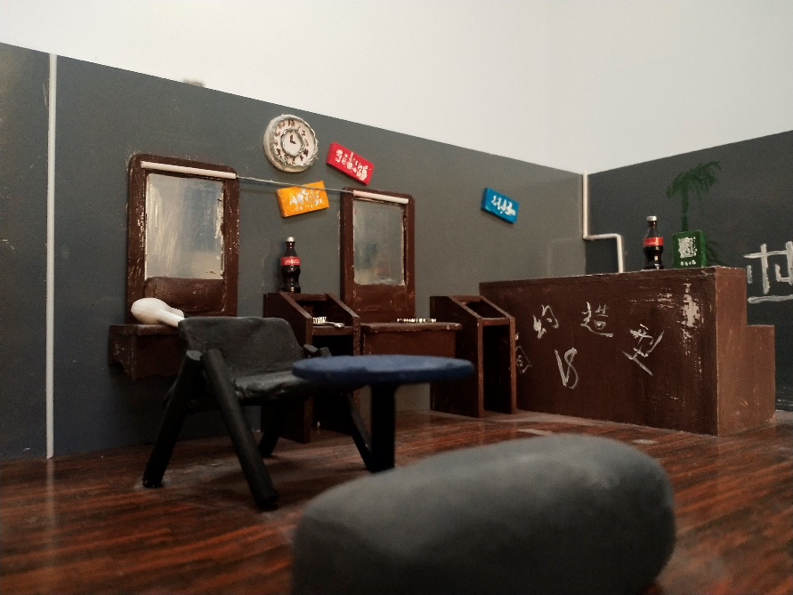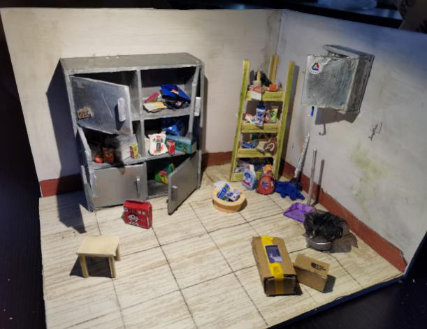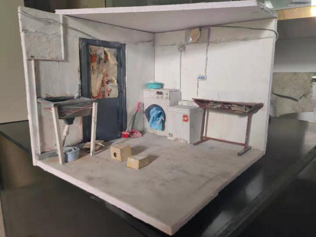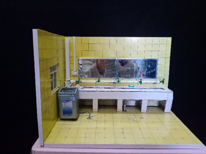 设计思路:我的模型主要是参考学校澡堂的设备间进行制作的,觉得它也具有生活的气息,制作前去测量好了它的长宽高然后按1:35的比例去做的。制作模型中的门窗,墙面,桌子这些东西时也翻阅了一些资料和去实地观察过。然后我的模型在视觉上主要是想体现出“狭长、窄”的整体效果。