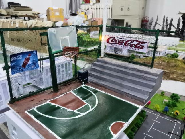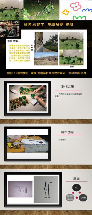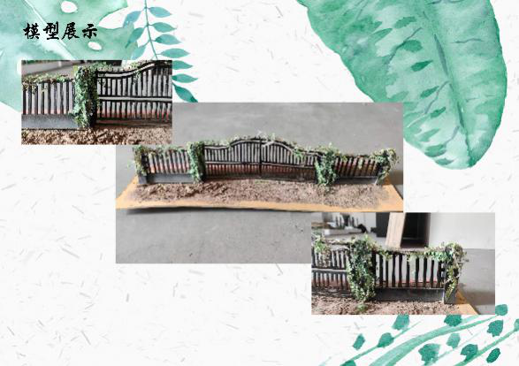 设计思路:灵感来自于学校中的一片绿地,使用了粘土体现了草地的起伏,绿色表达了夏季末期的绿意,四周栅栏使用了pvc板,底座使用了泡沫方便安插道具。