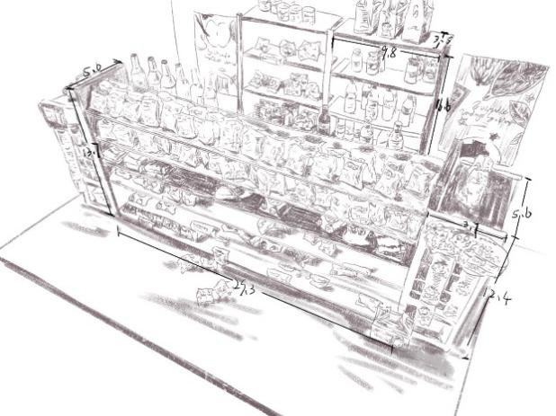 设计思路:水亦鲜茶是tyc539太阳食堂二层的一家饮品店,学生们经常去购买,有着很强的生活气息。所以选择作为此次作业的主体模型。前期绘制设计草图,实地测量尺寸,模型按照1:15来制作。