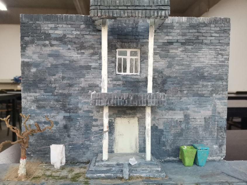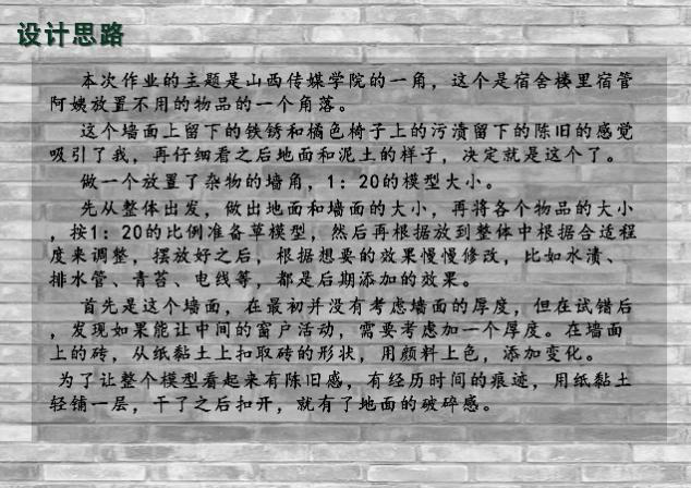 设计思路:观察生活练习选择了位于篮球场对面的职工宿舍楼。我习惯先画一张速写,边画边想。接着开始测量,楼层太高,无奈只能选择估算,后来的实践证明其实这样是不太好的,数据也在一直调整。这样做不严谨,也容易出问题。然后就是制作过程,主体物是后面的砖墙,我想了很多解决方案,最后选择了用陶泥,在泥还没干透的时候用刻刀画上砖,这是个体力活,而且还需要与时间赛跑。现在想来,其实做一堵墙没那么困难,难的是探索做它的过程。要义无反顾地去做,且忍受着未知的结果。幸运的是最后结果还不错,是我想要的砖墙。上色的时候,我上的很灰,因为我想尽量模仿砖墙的颜色,后来老师告诉我,这样不行,让我用深色渗进砖缝。刚开始我还有点不接受,我还在庆幸我的砖很像,后来做了之后。发现老师说得对,这样做确实感觉更好了。整个模型做下来,虽然有很多遗憾,但是也掌握了一些材料的应用,通过看大家的作业也学到了许多。这就是学习的过程嘛,我感觉整体来说,就还行。