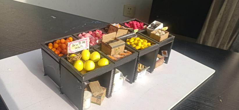 模型制作选择了饮品店铺一角来设计,展现了其丰富的饮品种类还有新鲜的水果,店铺摆放各色配料等。