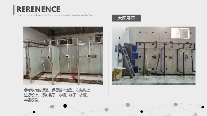 设计思路:参考学校的澡堂,保留基本造型,在结构上进行设计。添加凳子,水桶,梯子,衣柜,丰富模型。