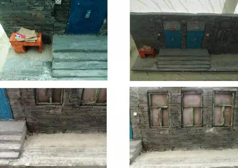 首先是这个墙面,在最初并没有考虑墙面的厚度,但在试错后,发现如果能让中间的窗户活动,需要考虑加一个厚度。在墙面上的砖,从纸黏土上扣取砖的形状,用颜料上色,添加变化。