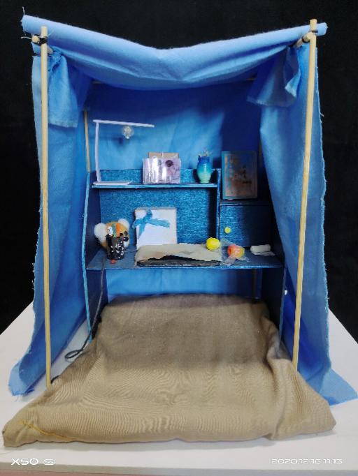 设计说明:这是我在学校的家,它是我可以获得独自思考的空间是我消缓一天疲意的空间,是我的私人空间。每每陷入这片蓝色,身心就会得到满足。