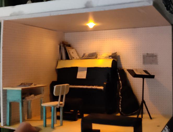 设计说明:白色的隔音墙、黑色钢琴和木质地板在暖色的灯光下散发着一种音乐独有的低调奢华感,四处散落的音乐书、乐谱也彰显着学生的刻苦练习,在几届学生的接手下,钢琴键也略显老旧,钢琴旁靠着的吉他也表现着学生的其他爱好。