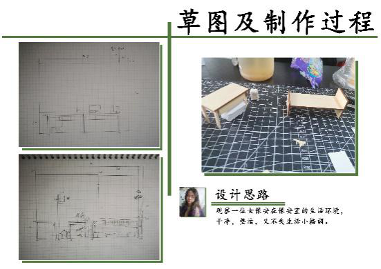 设计思路:观察一位女保安在保安室的生活环境,干净整洁,又不失生活小格调。1:25的比例还原,保安在保安室的生活,尽可能的使模型充满生活气息。