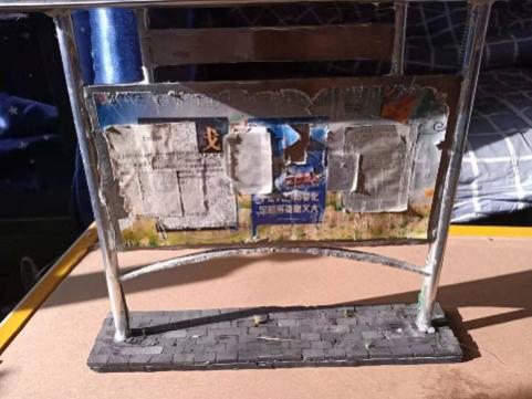 设计思路:广告栏,公告栏。在我们生活中随处可见。上面的广告会有今天贴的,昨天贴的,还会有一个礼拜一个月之前贴的。那他们的新旧程度自然不同。在我对生活场景模型的理解里,他不仅仅是告诉别人我做了一个这样的东西。我还想让他再放大十倍的时候。能够尽可能的和真实的公告栏更加的相似。所以在广告上面做了一些做旧的小处理。已经在广告栏的地面增加了很多小东西,比如烟头,小草,还有人走过时随处吐下的唾沫。然后用502以及纸巾,仿制出广告被撕掉后留下的痕迹。