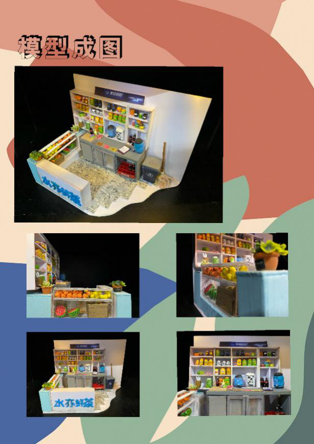 饮品店作为大多数学生常去光顾的店铺,来往学生众多,作为观察生活练习十分有趣。店铺颜色以蓝色为主,清新凉爽,使人心情愉悦。模型成品可爱清新,简单常见却有意想不到的惊喜,设计源于生活,要在生活中不断思考。