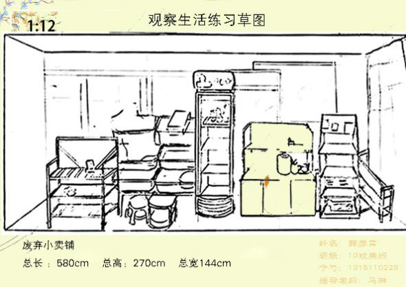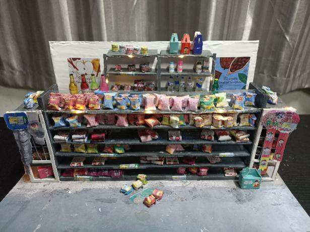 设计思路:观察生活练习,我以学校超市为对象做出了个人模型,以1:12的比例还原了超市的部分场景,也对模型超市进行了设计改变让它形成一个趣味超市,比如货架有些地方零食太过拥挤导致薯片掉落下来,还有的零食被一扫而空,墙上张贴着美味好看的海报,货架周围围绕着浪漫的小灯条。