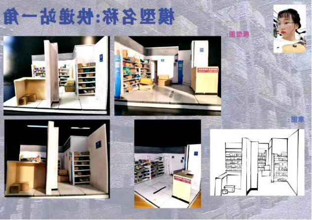 设计思路:在生活的场景的模型制作中所选取的是快递站的一角。现在网购的发展和流行使得在网上购物的人越来越多,相应的快递站也开始出现人们的来来往往,成了人们生活中的一处。