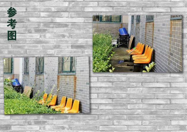 这个墙面上留下的铁锈和橘色椅子上的污渍留下的陈旧的感觉吸引了我,再仔细看之后地面和泥土的样子,决定就是这个了。做一个放置了杂物的墙角,1:20的模型大小。