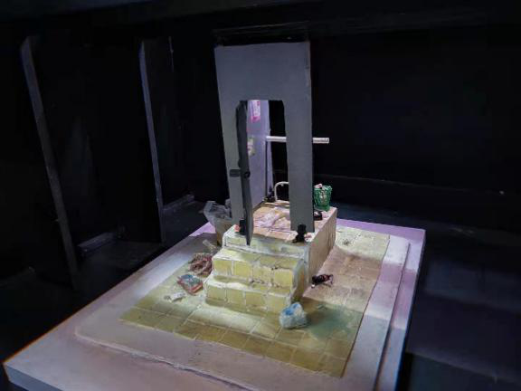 制作过程中所涉及的材料主要是用Kt板、木条和石灰粘土制成,通过后期的上色和做旧达到想要的效果。