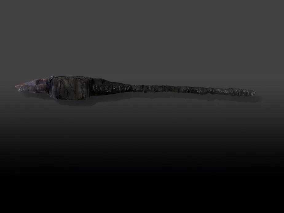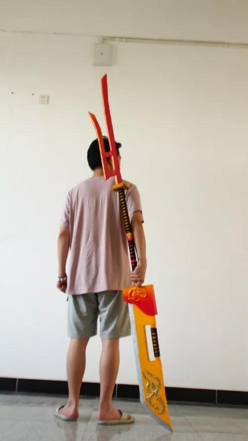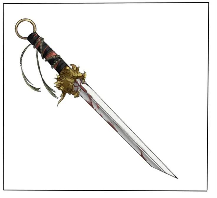 “弃身”总长45cm,刀柄长度17cm,刃长28cm,为唐环首障刀,刀柄为樟木,其上装饰黄铜雕刻“獬豸”,代表迟顾二家廉洁奉公,刚正不阿,为了大义公正皆可“弃身”。