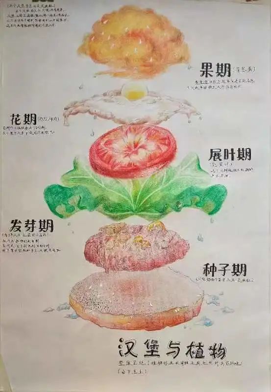 设计说明:该系列作品皆以汉堡为主元素,大稿以汉堡的组成整体呈现了植物的生长周期及其生长所需的环境。小稿体现了以下理念:汉堡含有大量的肉、蔬菜、碳水化合物、很多高油脂以及高糖的食物,带来过量的热量,容易热量超标,长期食用会导致身体肥胖、营养不良、损害智力、血液粘稠等症状。但它华丽的外貌和美味的味道却常常让人欲罢不能,尤其为正处于生长发育期的小朋友们所喜爱,所以要适量食用。