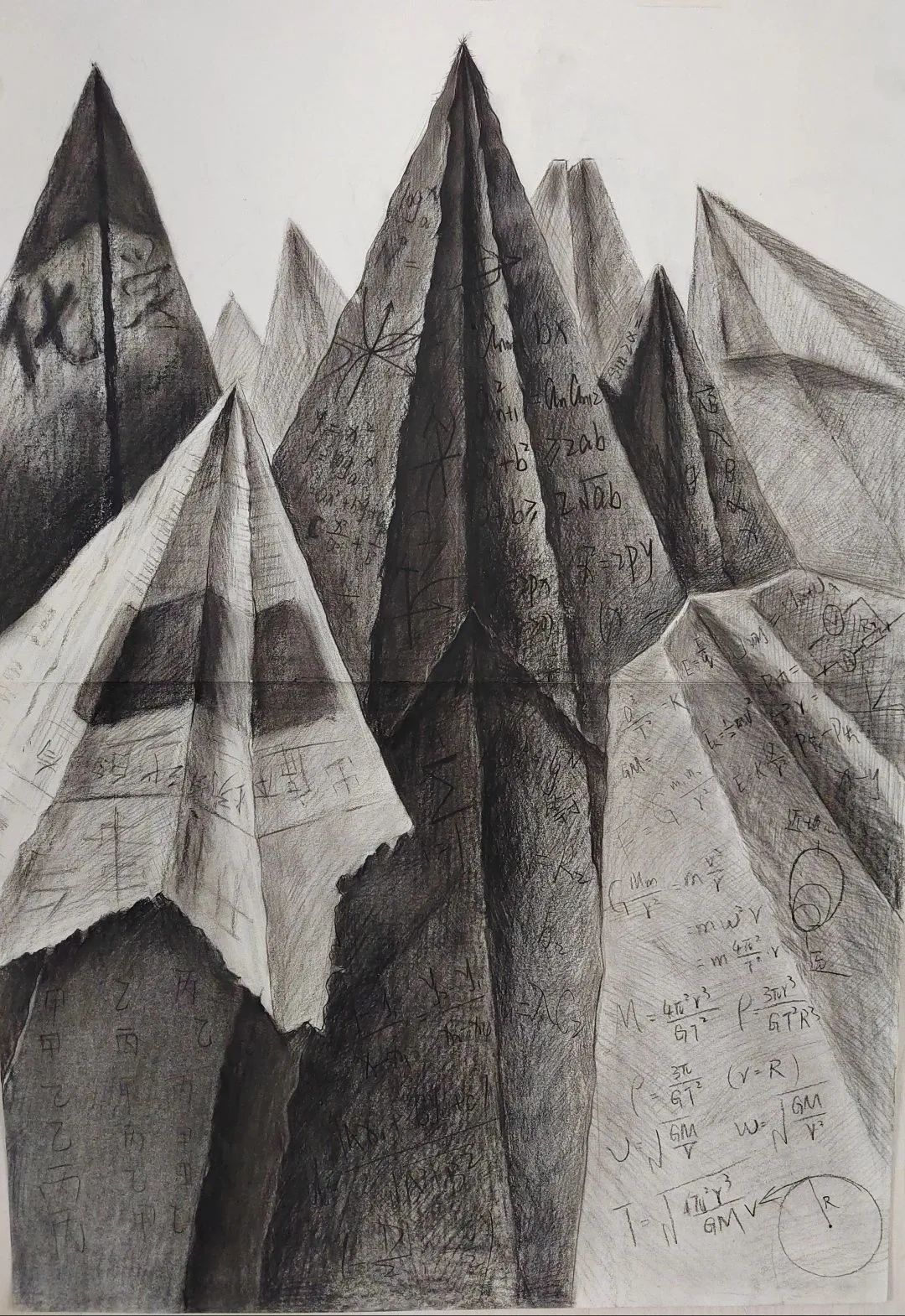 设计说明:元素A是折过的报纸,元素B是风景,把报纸折成纸飞机,纸飞机的头就像是山峰的峰顶,然后好几个纸飞机排练组合在一起,就像是群山环绕,恰好每个纸飞机都是由不同内容的报纸折成的,纸飞机很多,所以知识非常的丰富,排列组合看成群山环绕的时候,也会给人一种丰富的感觉。