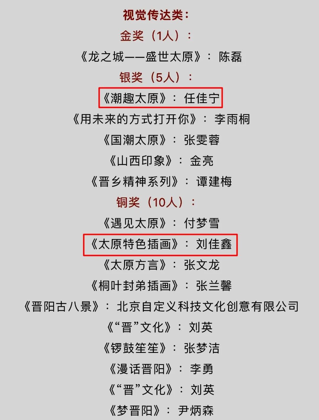 2021年11月5日,第二届“印记太原”文化创意设计大赛正式启动。本次大赛由中共太原市委宣传部、太原市文化和旅游局主办,太原市文化产业协会承办。大赛主题为“创意锦绣太原 设计美好生活”,意在通过“印记太原”系列活动,进一步彰显太原文化魅力,提升城市品质和市民文明素质,展示太原文明开放富裕美丽崭新形象、促进山西文旅产业高质量发展。我院视觉传达设计专业师生积极参与并取得优异成绩。视觉传达设计教研室主任高鹏荣获十佳新锐设计师奖,2017级视觉传达设计专业毕业生任佳宁同学作品《潮趣太原》在视觉传达类中荣获银奖,刘佳鑫同学作品《太原特色插画》荣获铜奖。